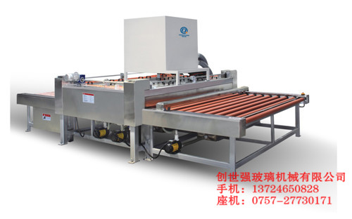 包括不銹鋼殼體、傳送輪、膠輥、毛刷、傳送支架、電控箱,不銹鋼殼體的側面玻璃入口處設有引輪,傳送支架上設有若干靠輪,傳送支架的下部設有并行排列且通過若干聯(lián)動片銜接的若干組傳送輪,玻璃清洗機內(nèi)腔的另一側設有膠輥,膠輥的左側設有若干毛刷,靠近玻璃出口處設有風口。避免了二次清洗,有效的提高了產(chǎn)品清洗的工作效率;采用觸摸顯示屏操作系統(tǒng),并可隨時監(jiān)測設備運行和隨時監(jiān)測設備故障;設備安裝調試快速、便捷,清洗機主體結構和內(nèi)部采用不銹鋼材料;減少電耗。